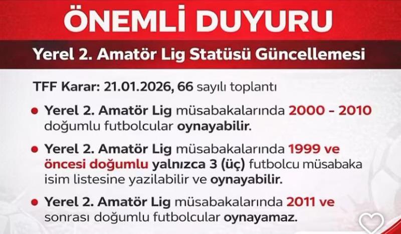 Türkiye Futbol Federasyonu (TFF), 26 Ocak 2026 tarihinde yayımladığı güncelleme ile 2. Amatör Küme yaş statüsünde önemli bir değişikliğe gitti. Yeni düzenlemeyle birlikte 2000 doğumlu futbolcular artık kontenjan oyuncu statüsünde sayılmayacak. Bu yaş grubu, diğer genç oyuncularla birlikte "normal yaş grubu" içinde değerlendirilecek. Yeni yaş sınırları belirlendi Yapılan düzenlemeye göre: 2000 – 201