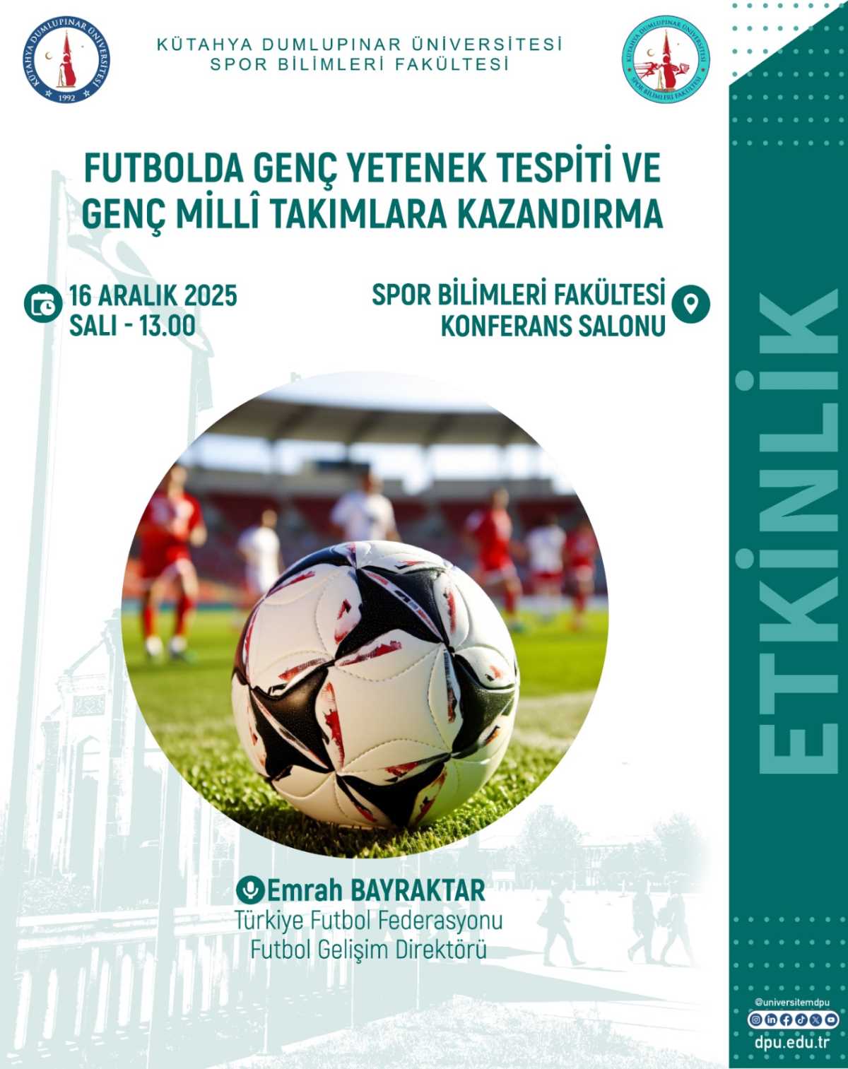Dumlupına Üniversitemizin Spor Bilimleri Fakültesi tarafından düzenlenen Türkiye Futbol Federasyonu Futbol Gelişim Direktörü Emrah Bayraktar’ın konuşmacı olarak katılacağı Futbolda Genç Yetenek Tespiti ve Genç Milli Takımlara Kazandırma başlıklı etkinlik, 16 Aralık 2025 Salı günü saat 13.00'de Spor Bilimleri Fakültesi Konferans Salonu'nda gerçekleştirilecektir. tüm Yöneticilerimiz Antrenörlerimiz ve spor severler davetlidir