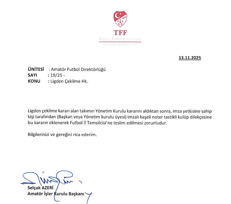 Türkiye Futbol Federasyonunun Amatör Futbol Direkttörlüğünün Federasyonumuza gönddermiş olduğu talimat gereği Ligden Çekilme kararı alan takım Yönetim Kurulu Kararını aldıktan sonra imza yetkisine sahip kişi tarafından ( Başkan veya Yönetim Kurulu Üyesi ) İmzalı Kaşeli noter tastikli kulüp dilekçesine bu kararını ekleyerek Futbol İl Temsilcisine teslim etmesi zorunludur
