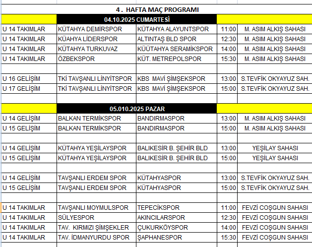 2025 - 2026 SEZONU U 14 TAKIMLAR MÜSABAKALARI 04 - 05 EKİM 2025 TARİHİNDE BAŞLIYOR MÜSABAKALARIN MAÇ PROGRAMLARI SİTEMİZDE YAYINLANMIŞTIR AYRICA TFF DİJİTAL SİSTEMDE GÖZÜKMEKTEDİR KULÜPLERİMİZ SIKINTI YAŞAMAMALARI İÇİN LİSANS İŞLEMLERİNİ BİR AN ÖCE TAMAMLAMALARI GEREKMEKTEDİR KÜTAHYA ASKF YÖNETİM KURULU OLARAK TAKIMLARIMIZA YENİ SEZONDA BAŞARILAR DİLİYORUZ