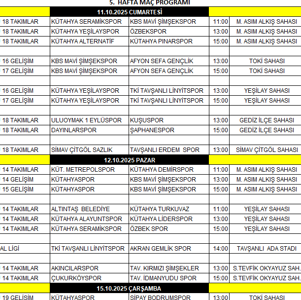 2025 - 2026 SEZONU U 18 TAKIMLAR MÜSABAKALARI 11 EKİM 2025 TARİHİNDE BAŞLIYOR MÜSABAKALARIN MAÇ PROGRAMLARI SİTEMİZDE YAYINLANMIŞTIR AYRICA TFF DİJİTAL SİSTEMDE GÖZÜKMEKTEDİR KULÜPLERİMİZ SIKINTI YAŞAMAMALARI İÇİN LİSANS İŞLEMLERİNİ BİR AN ÖCE TAMAMLAMALARI GEREKMEKTEDİR KÜTAHYA ASKF YÖNETİM KURULU OLARAK TAKIMLARIMIZA YENİ SEZONDA BAŞARILAR DİLİYORUZ